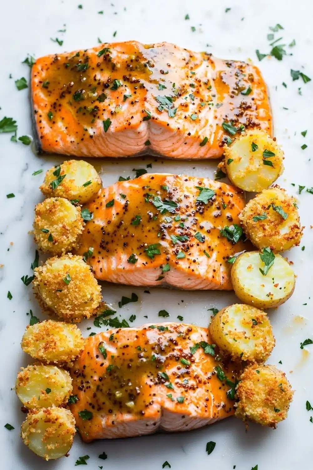 A delicious and easy sheet pan dinner featuring tender salmon fillets glazed with a sweet and tangy honey mustard sauce, paired with crispy panko-coated roasted potatoes. Perfect for a quick weeknight meal with minimal cleanup.