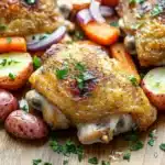 There’s something about the smell of roasting chicken mingling with earthy carrots and sweet onions that immediately slows down the chaos of an evening. I remember that one time I almost forgot the timer — distracted by a phone call — and ended up with chicken skin just a little extra crispy, bordering on charred in spots, but honestly, it was still delicious. The kind of dinner where you don’t mind those tiny imperfections because the flavors come through so well. This baked chicken thigh dinner is one of those meals that feels like it’s made with care, even if the timing isn’t perfect. The mix of herbs and smoky paprika paints the kitchen with warmth, while the potatoes soak up all those juices, making every bite a little celebration.
