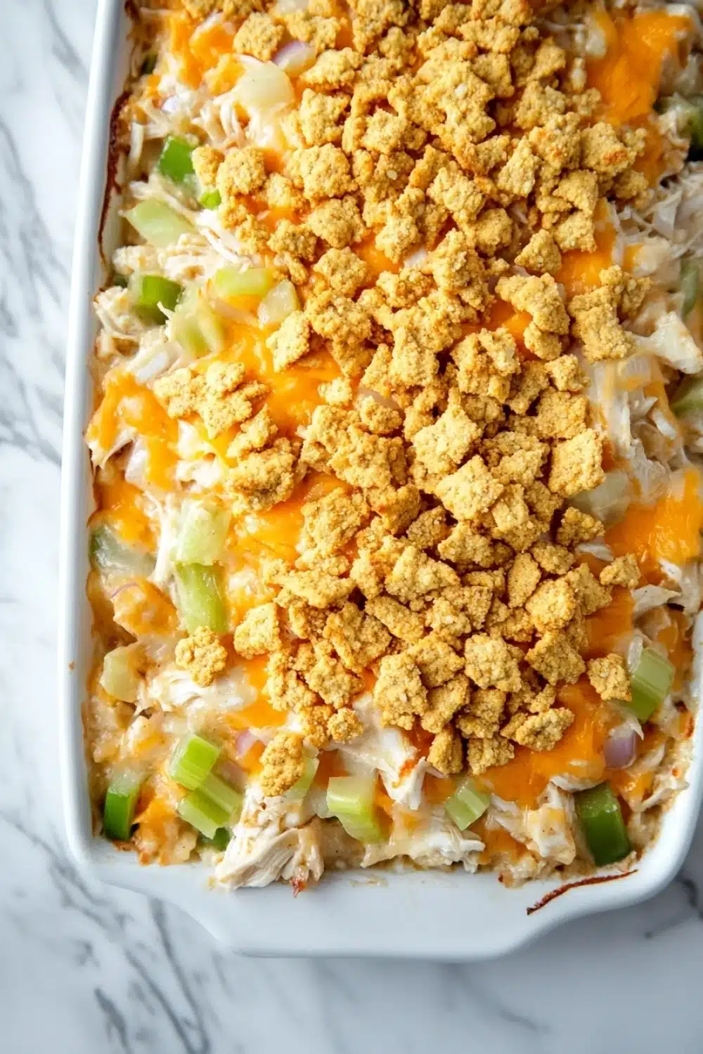 This casserole bakes in a standard dish — nothing fancy required — just something large enough to hold all the goodness. It’s great served alongside a crisp green salad or simple steamed veggies. I’ve tried swapping out the cheddar for pepper jack for a little kick, but honestly, the classic cheddar feels just right here. Sometimes I toss in a handful of frozen peas or corn for color and a bit of sweetness, but I haven’t tested those tweaks enough to swear by them. If you like things extra creamy, a dollop of sour cream on top after baking adds a tangy finish. Just don’t skip the Ritz topping — it’s the star.