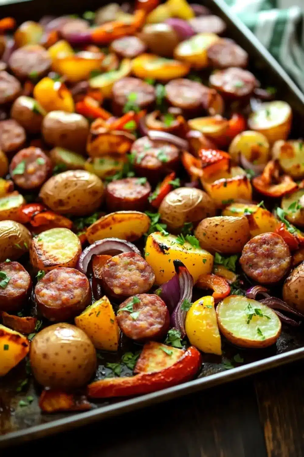 Kitchen Notes: You don’t need anything fancy to pull this off — a sturdy rimmed baking sheet and a bit of patience. Serving it straight from the pan feels homey, but it also pairs well with a simple green salad to brighten the plate. If you want to switch things up, swapping smoked sausage for chicken sausage or adding mushrooms works pretty well, though I haven’t tested every variation extensively. For an extra kick, a drizzle of hot sauce after baking adds a nice punch.