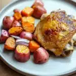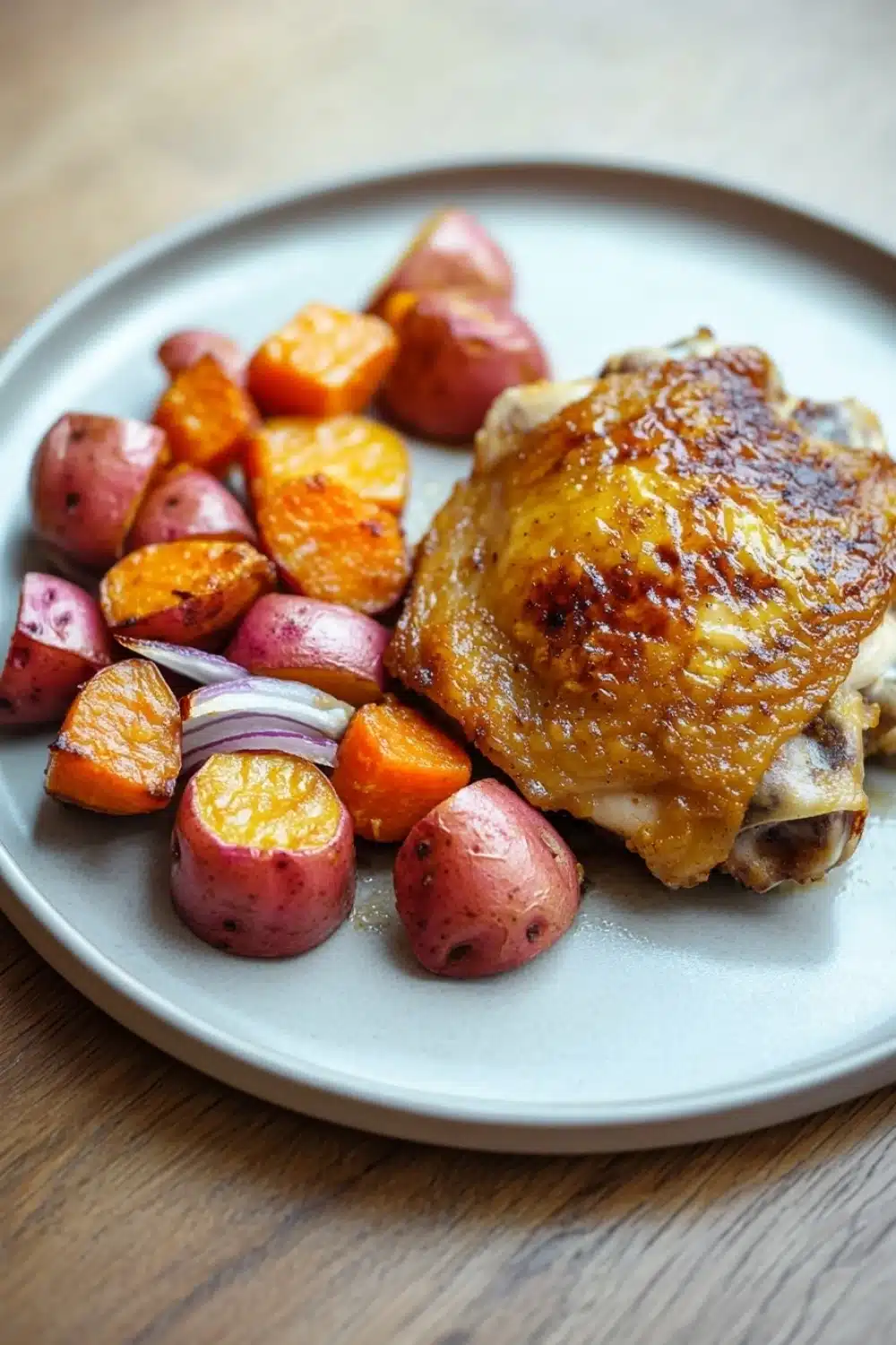 A simple and flavorful baked chicken thigh dinner featuring crispy skin and tender meat, served with roasted vegetables for a complete meal.