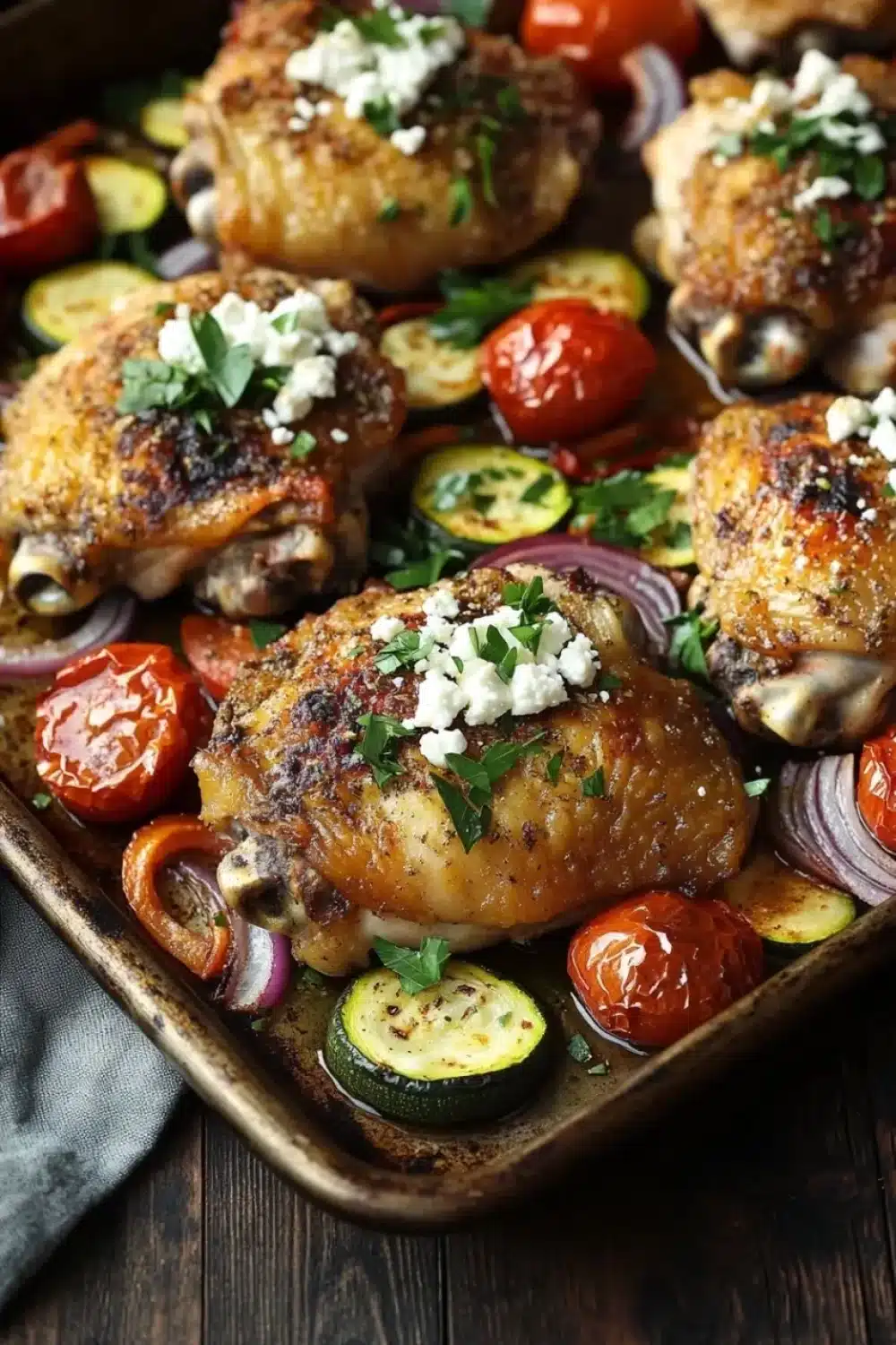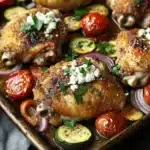 A flavorful and easy one-pan meal featuring juicy lemon-herb marinated chicken thighs, roasted mixed vegetables, and crumbled feta cheese. Perfect for a quick weeknight dinner with minimal cleanup.