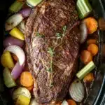 A tender and flavorful beef loin tri tip roast cooked slowly in a crock pot with aromatic herbs and vegetables, perfect for an easy and hearty meal.