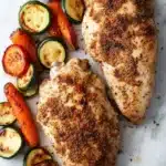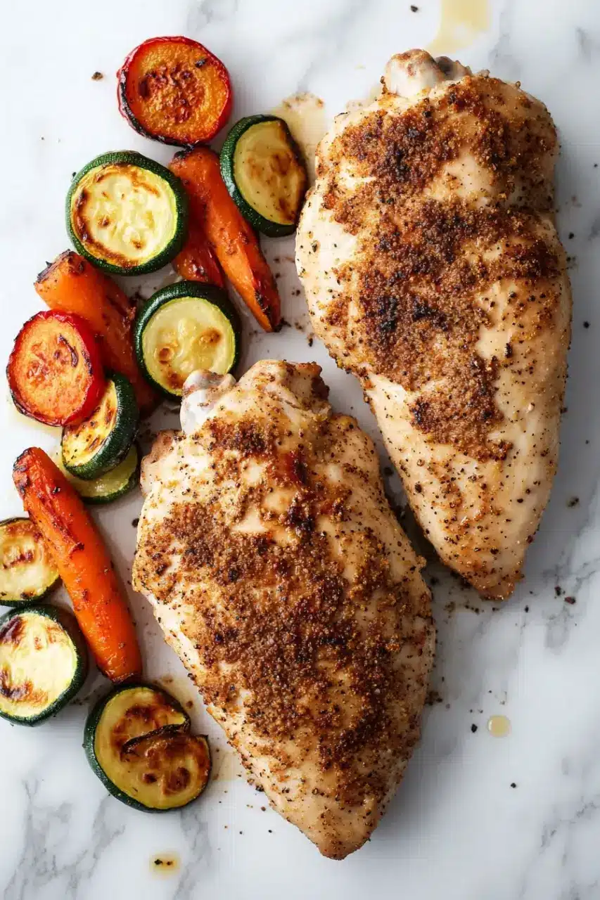 A quick and healthy air fryer chicken breast dinner featuring juicy, seasoned chicken breasts cooked to perfection, served with roasted vegetables for a complete meal.