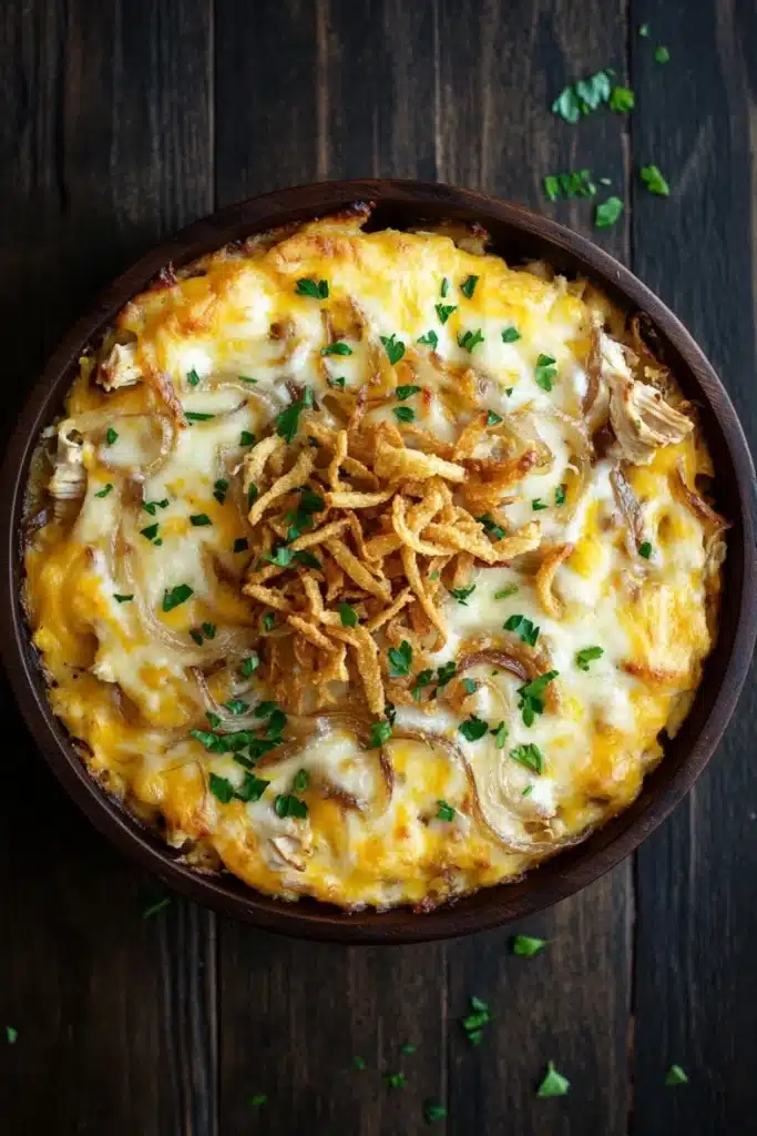 Dive into a layered experience of tender chicken, rich caramelized onions, and a creamy cheese blanket topped with crispy onions. This casserole is all about warmth and simple indulgence.
