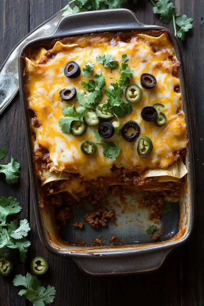 Dive into layers of rich enchilada sauce, tender beef, and melted cheese with this hearty casserole that’s as comforting as a warm hug after a long day.
