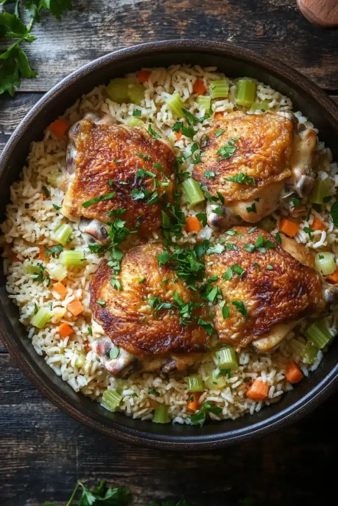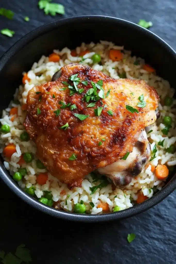This one-pot chicken and rice recipe brings comfort and ease to your dinner table, blending crispy chicken thighs with tender seasoned rice and veggies in one pan.