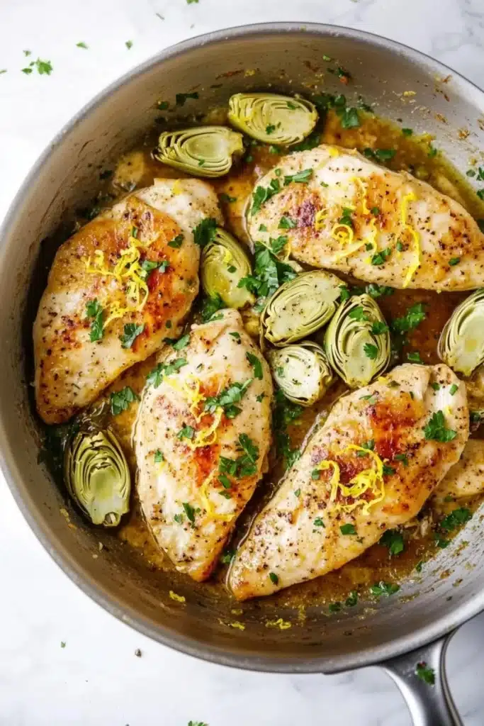 This skillet lemony chicken and artichokes dish brings a fresh twist to weeknight dinners with its vibrant lemon sauce and tender artichokes—all cooked in one pan for easy cleanup.