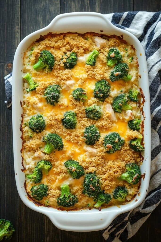 Sink into a warm, cheesy casserole that feels like a hug after a long day. Fresh broccoli, tender chicken, and a crispy topping come together in this comforting dish.