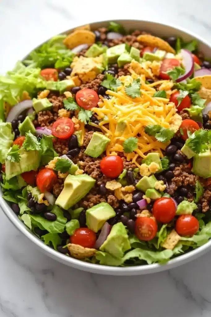 This high protein beef taco salad brings together warm spiced beef, fresh crunchy veggies, and a tangy lime dressing that’s ready in about 30 minutes. It’s a satisfying way to fuel your evening with flavor and protein.