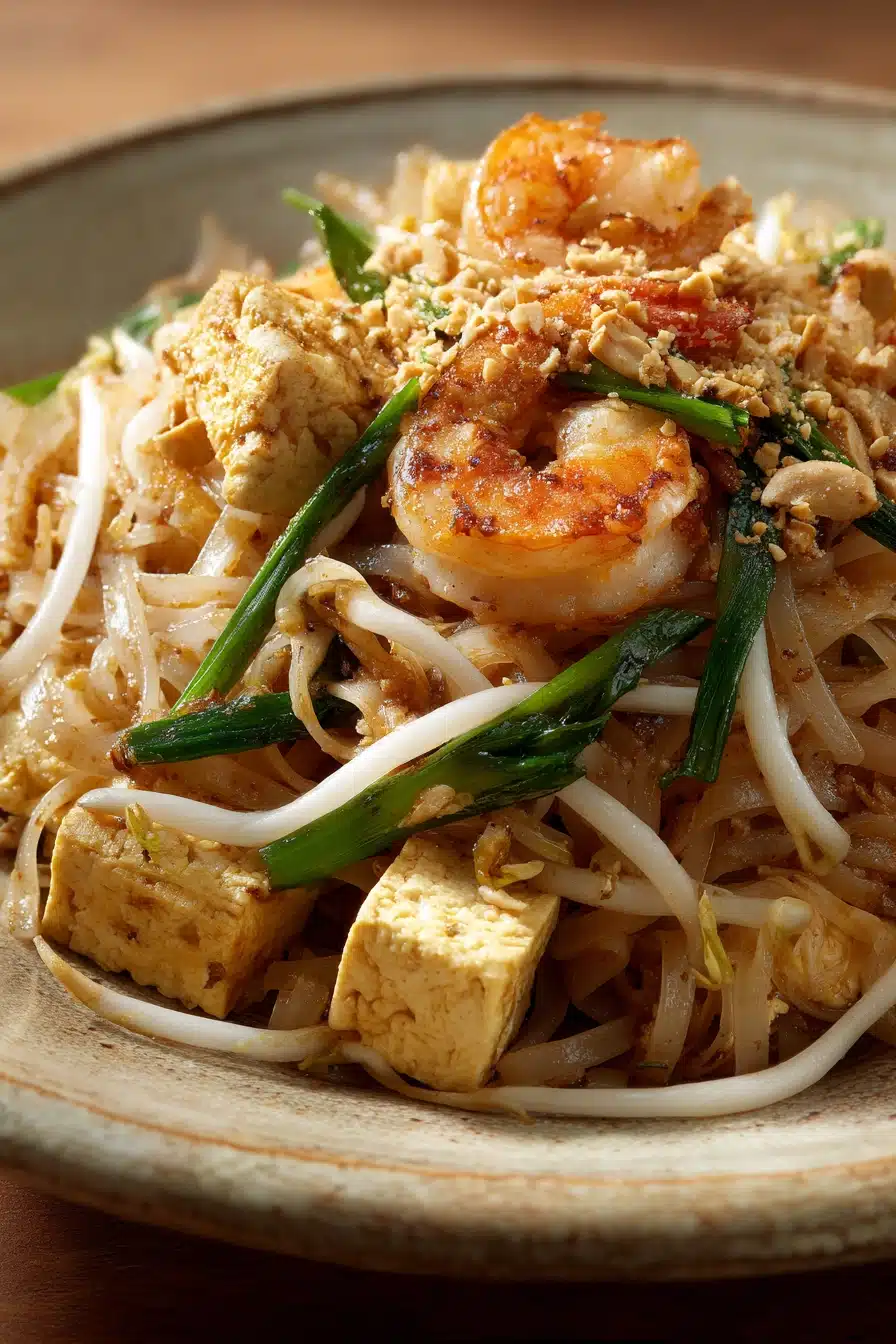 A traditional Thai stir-fried noodle dish with a perfect balance of sweet, sour, and savory flavors, featuring rice noodles, shrimp, tofu, and a tangy tamarind sauce.