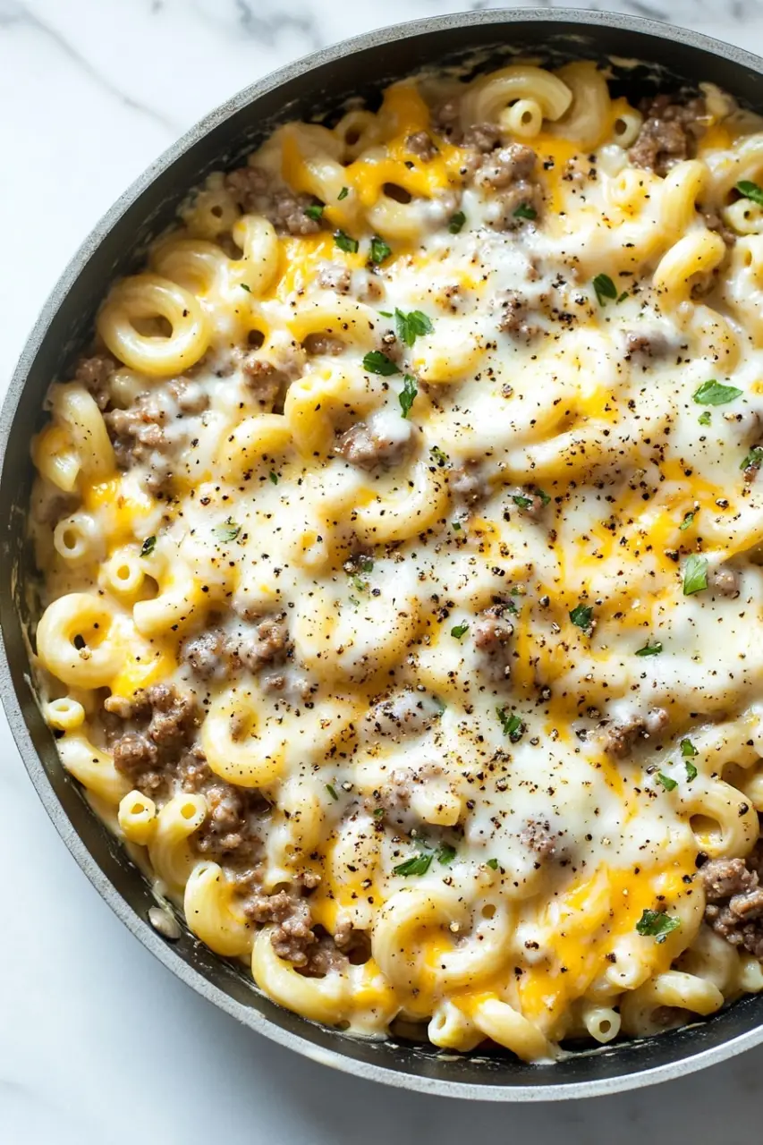 A comforting and hearty one-pan meal featuring tender ground beef, elbow macaroni, and a rich, creamy cheese sauce all cooked together in a skillet for an easy and delicious dinner.