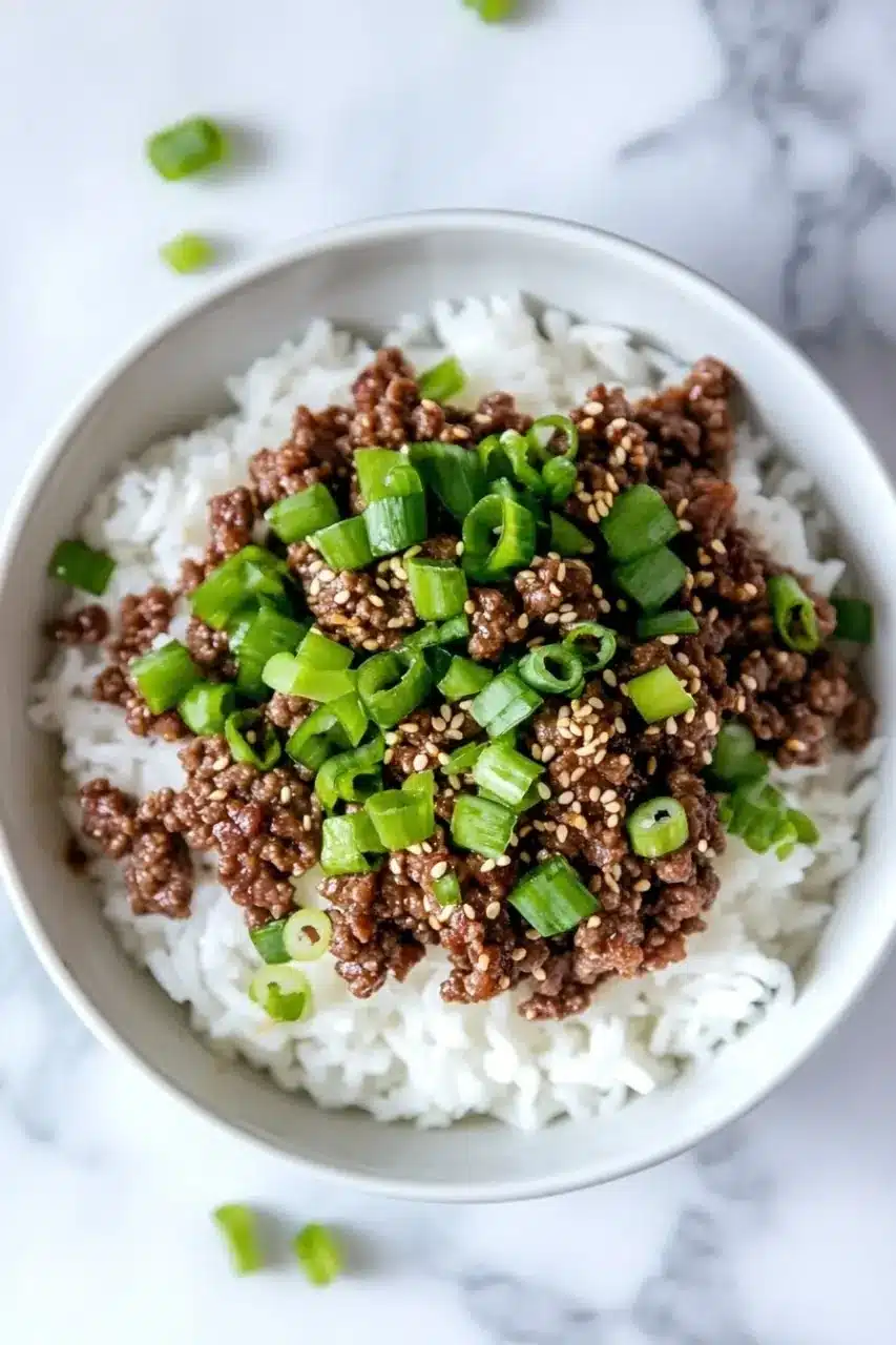 A flavorful and easy-to-make Korean beef bowl that can be prepared in advance and frozen for quick meals. Tender ground beef cooked in a savory-sweet sauce served over steamed rice with fresh green onions and sesame seeds.
