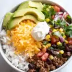 A flavorful and easy-to-make ground beef taco rice bowl packed with seasoned beef, rice, fresh toppings, and a zesty lime crema. Perfect for a quick weeknight dinner or meal prep.