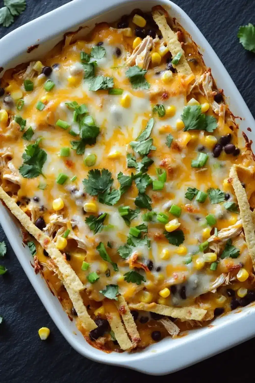 Repeat layers with the remaining tortilla strips, chicken mixture, and cheeses.