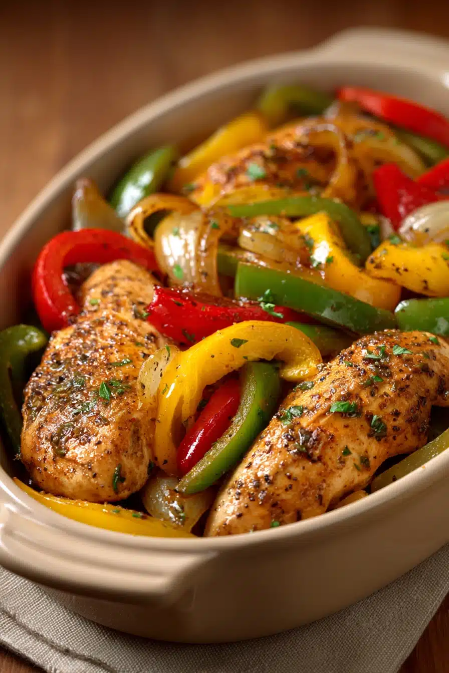 A flavorful and easy one-pan chicken fajita bake featuring tender chicken breasts, colorful bell peppers, and onions, all seasoned with classic fajita spices and baked to perfection. Perfect for a quick weeknight dinner!