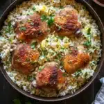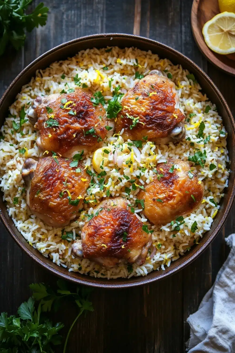 A flavorful and easy one pot meal combining tender chicken thighs with fragrant lemon-infused rice, perfect for a comforting weeknight dinner.