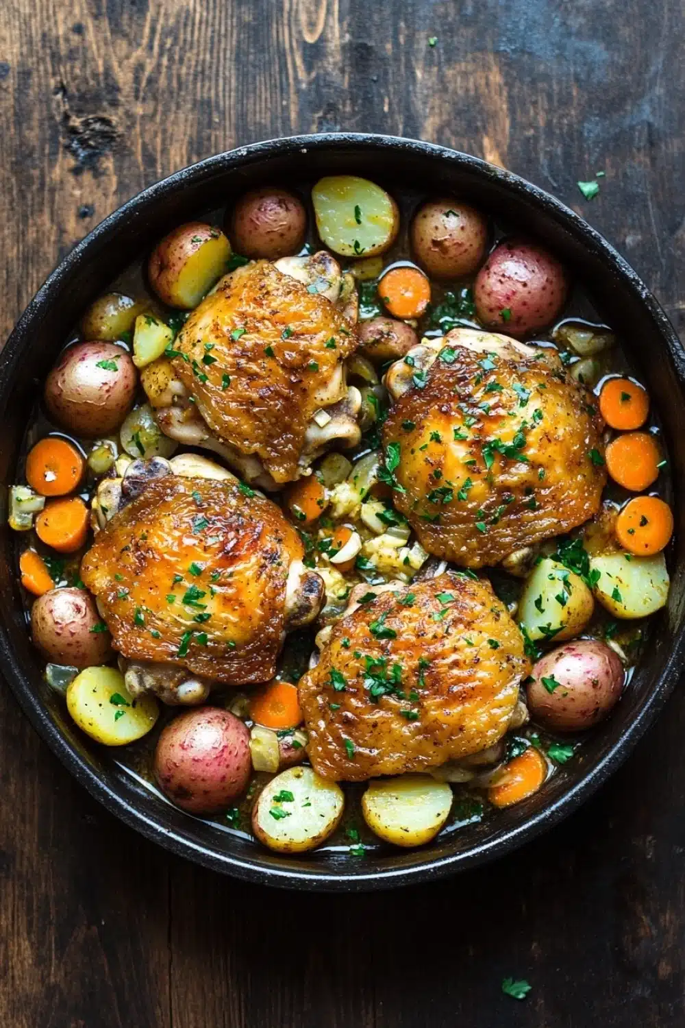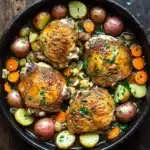 I remember the first time I tried this recipe; it was one of those evenings when the day had slipped away faster than I expected. The house was a little messier than I liked, and my mind was wandering between what needed to be done and what I actually wanted — which was just to sit down and enjoy a good meal. As I browned the chicken, the aroma of garlic and herbs filled the room, and suddenly the chaos felt a bit more manageable. The golden, crispy chicken skin was almost too tempting to wait for, and when the veggies softened in the fragrant broth, it was like a small reward for the day. I wasn’t perfect in timing — I left the lid off a bit too soon and had to adjust the heat — but that little imperfection made it feel like a real dinner, not a staged photo shoot.