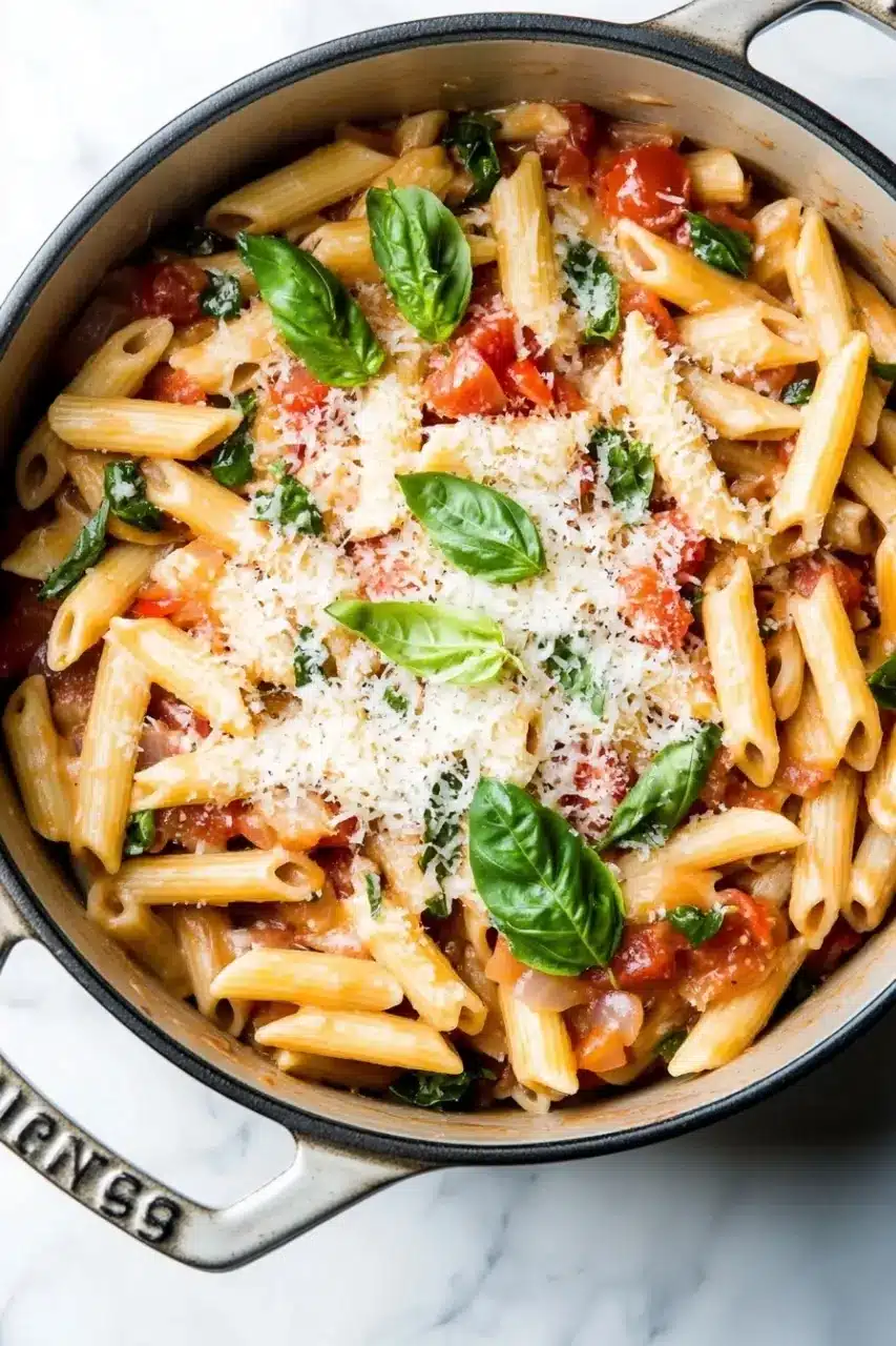 A simple and delicious one pot pasta recipe cooked entirely in a Dutch oven. Perfect for a quick weeknight meal with minimal cleanup, featuring pasta, tomatoes, garlic, and fresh basil.