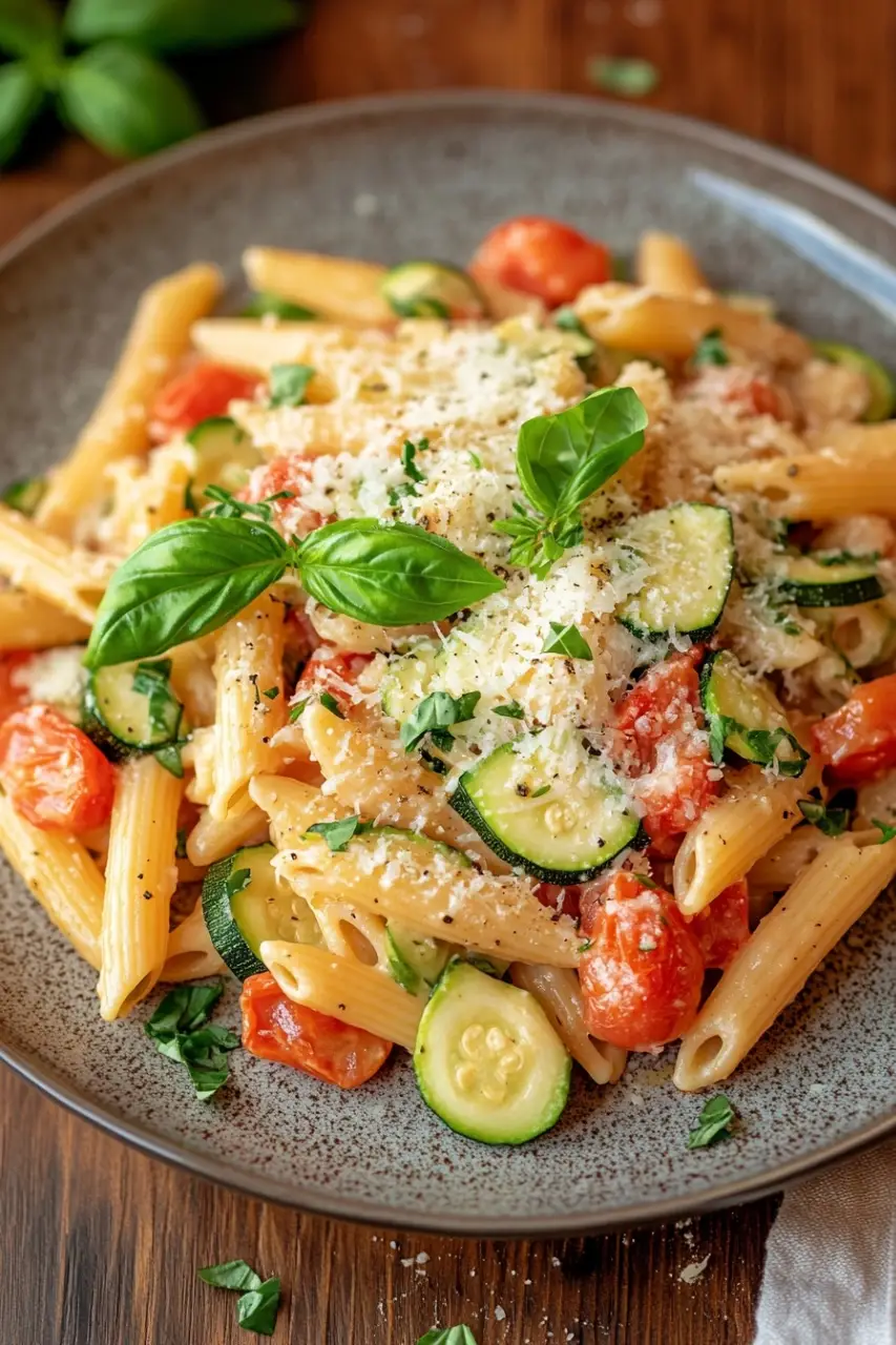 A quick and easy one pot pasta dish featuring tender zucchini, garlic, and a light tomato sauce, perfect for a simple weeknight meal.