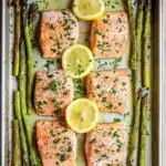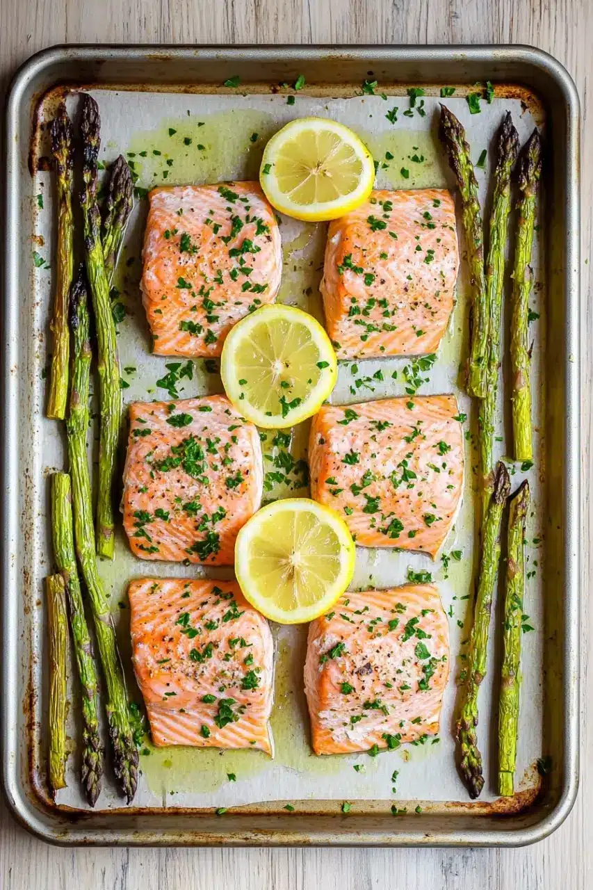 A simple and healthy one-pan meal featuring perfectly roasted salmon fillets and tender asparagus, seasoned with lemon and garlic for a delicious and quick dinner.