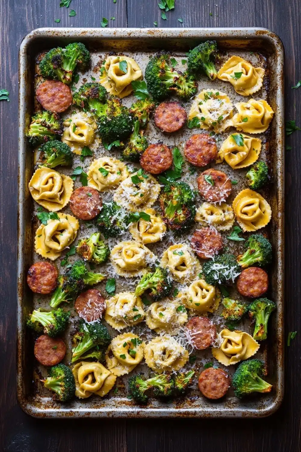 A quick and easy one-pan meal featuring savory Italian sausage, cheese-filled tortellini, and roasted broccoli, all baked together on a sheet pan for a delicious and comforting dinner.