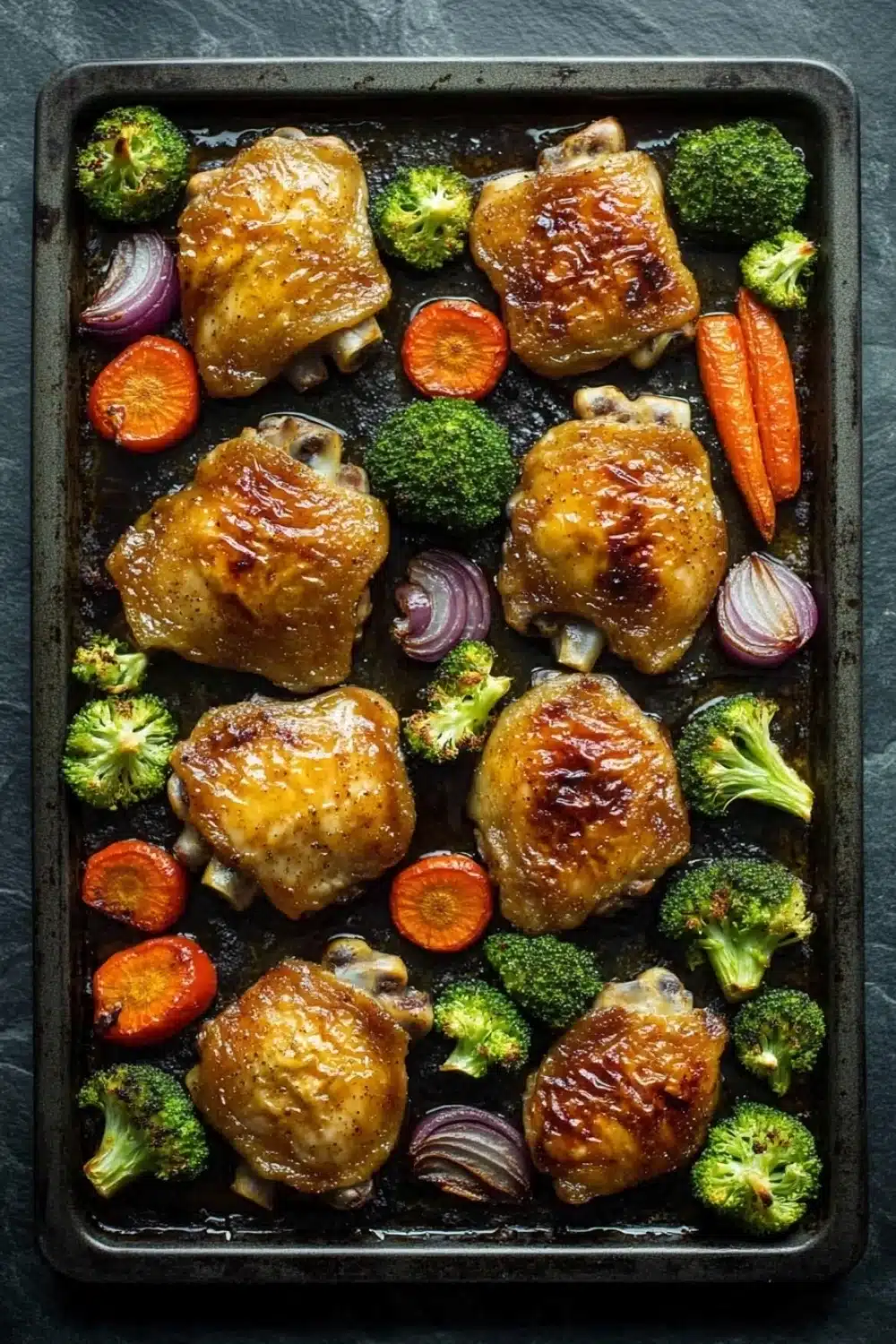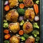 A simple and flavorful one-pan meal featuring juicy chicken thighs roasted with a honey garlic sauce alongside tender vegetables. Perfect for an easy weeknight dinner with minimal cleanup.