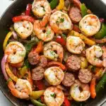 A flavorful and easy one-pan meal combining juicy shrimp and smoky sausage with bell peppers, onions, and a blend of spices, perfect for a quick dinner.