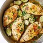 A bright and flavorful one-pan meal featuring tender chicken breasts, tangy lemon, and tender artichoke hearts cooked together in a savory skillet sauce.