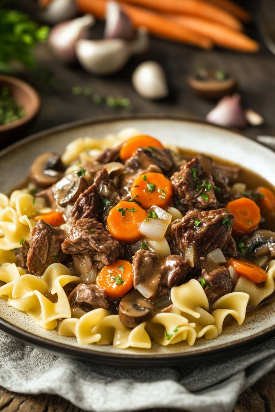 The first time I made this, I was a little distracted—trying to juggle a phone call and keep an eye on the kids—but the smell kept pulling me back to the kitchen. Somewhere between the sizzling of browned beef and the gentle bubbling of the stew, I realized how much this meal felt like a hug on a plate. The noodles, cooked just right, soak up all that rich sauce, and even though I kind of forgot to stir the stew once or twice, it turned out tender and full of flavor anyway.
