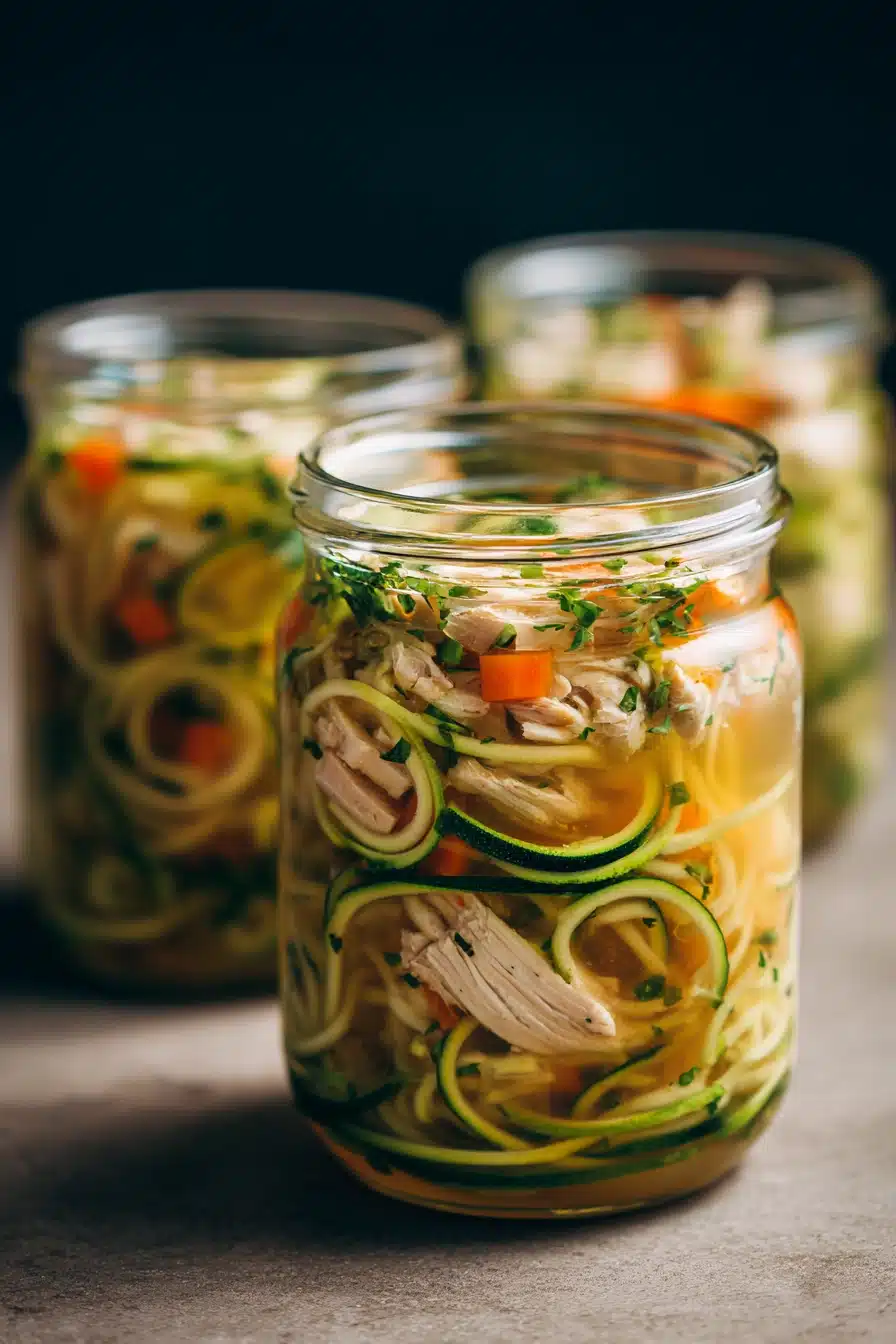 I remember the first time I made this soup for a hectic workweek. The kitchen smelled like a cozy little café, with garlic and herbs blending into the simmering chicken broth. While the soup bubbled gently, I spiralized fresh zucchinis, their crisp scent mingling with the warmth of the broth. Packing each jar felt like sending a little hug through the day—something wholesome and satisfying, yet light enough to leave me energized. Later, when I pulled a jar from the fridge and warmed it up, the noodles were tender, and the soup tasted even better than I remembered. A simple meal, but one that made those rushed moments feel a bit more manageable and a lot more delicious.