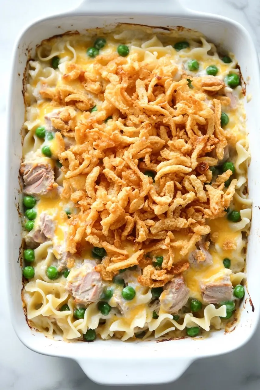 A comforting and easy-to-make tuna casserole topped with crispy French fried onions, perfect for a family dinner or potluck.