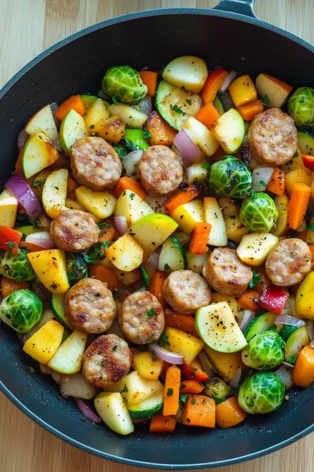 Return the browned apple chicken sausage to the skillet and stir to combine with the vegetables.
