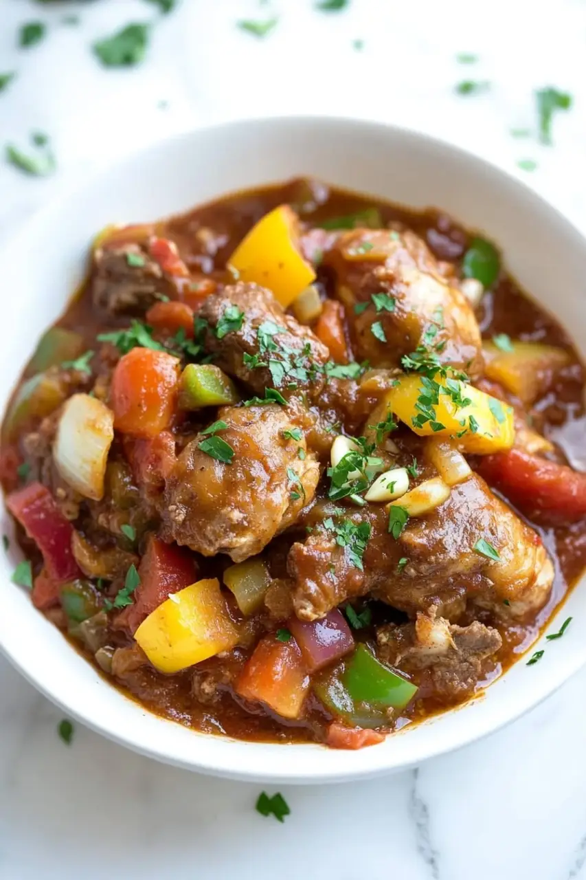 A hearty and flavorful Italian classic combining tender chicken thighs and beef simmered in a rich tomato sauce with bell peppers, onions, and aromatic herbs.