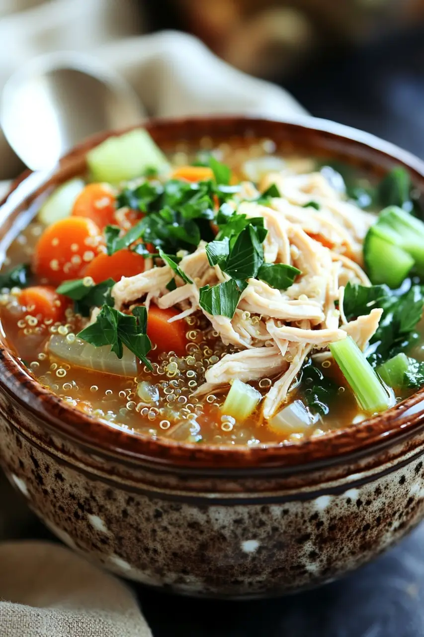 A hearty and healthy crock pot chicken quinoa soup packed with tender chicken, nutritious quinoa, and fresh vegetables. Perfect for an easy, comforting meal.