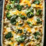 A comforting and easy-to-make casserole combining tender chicken, broccoli, rice, and creamy mushroom soup baked to perfection.