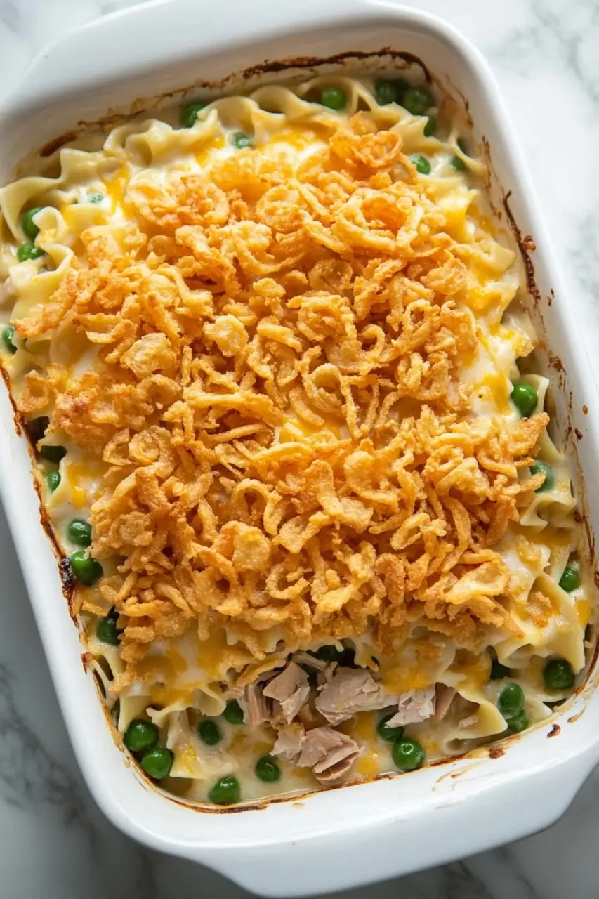 A comforting and easy-to-make tuna casserole topped with crispy French fried onions. This classic dish combines tender noodles, creamy mushroom soup, and savory tuna for a hearty meal perfect for family dinners.