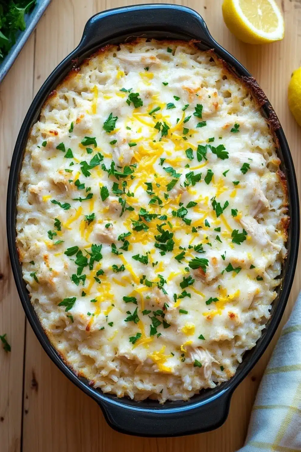 A comforting and flavorful creamy lemon chicken rice casserole that combines tender chicken, fluffy rice, and a zesty lemon cream sauce baked to perfection.