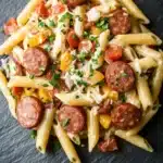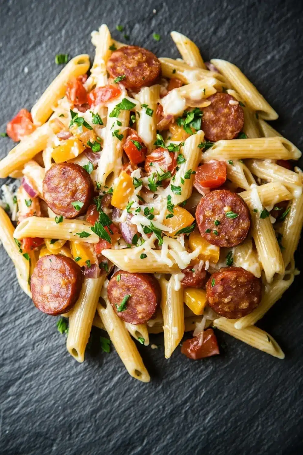 A hearty and flavorful pasta dish featuring smoky kielbasa sausage, sautéed vegetables, and a savory tomato sauce, perfect for a comforting dinner.