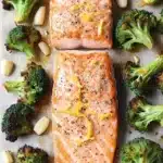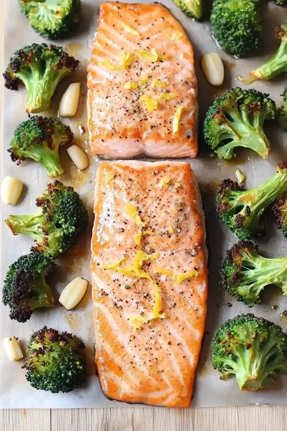 A simple and healthy sheet pan dinner featuring tender salmon fillets and roasted broccoli, seasoned with garlic and lemon for a flavorful meal in under 30 minutes.