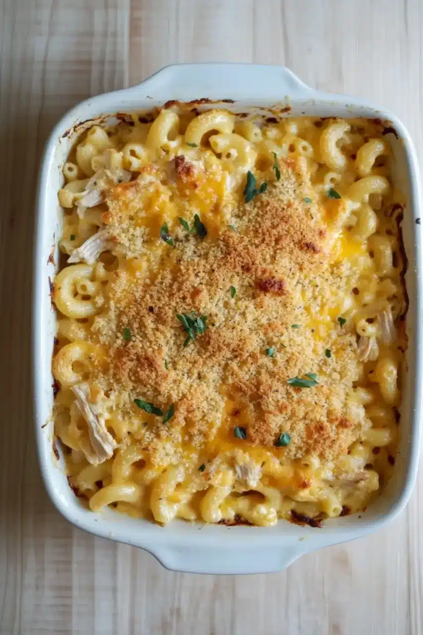 A comforting and hearty baked casserole combining tender chicken, creamy mac and cheese, and a crispy golden topping. Perfect for a family dinner or meal prep.