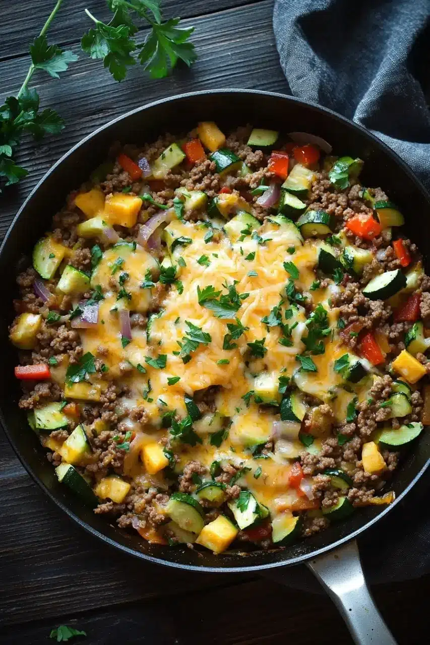 A quick and flavorful ground beef zucchini skillet that combines savory beef with tender zucchini and aromatic spices for a healthy and satisfying meal.