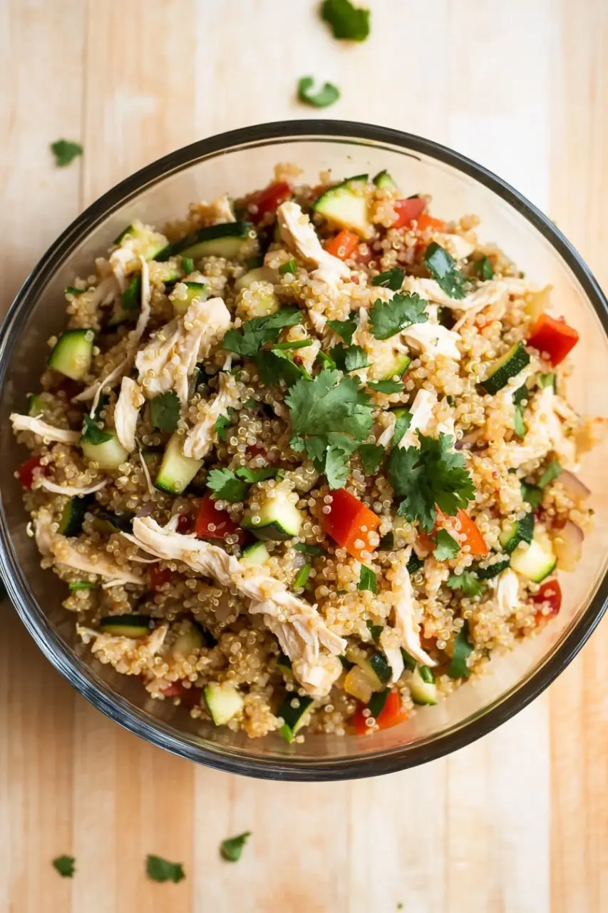 Return the shredded chicken to the crock pot and stir to combine with the quinoa and vegetables.