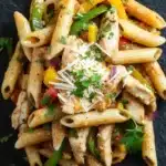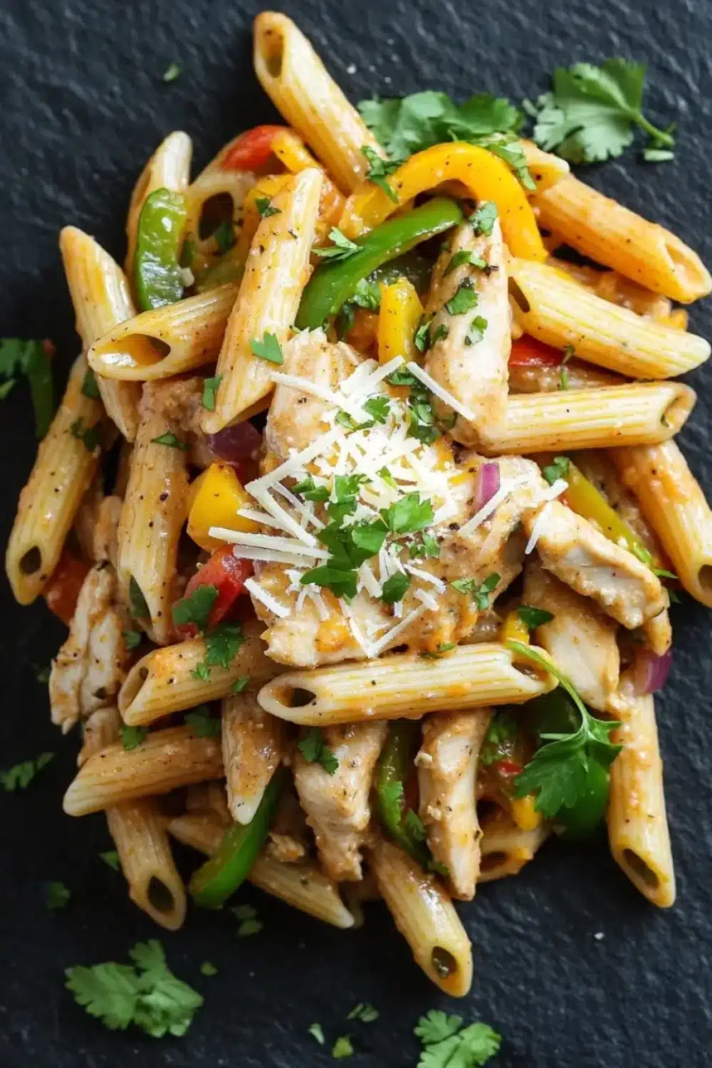 A flavorful and protein-packed chicken fajita pasta combining tender chicken, sautéed bell peppers and onions, and a creamy, spicy sauce tossed with whole wheat pasta for a satisfying meal.