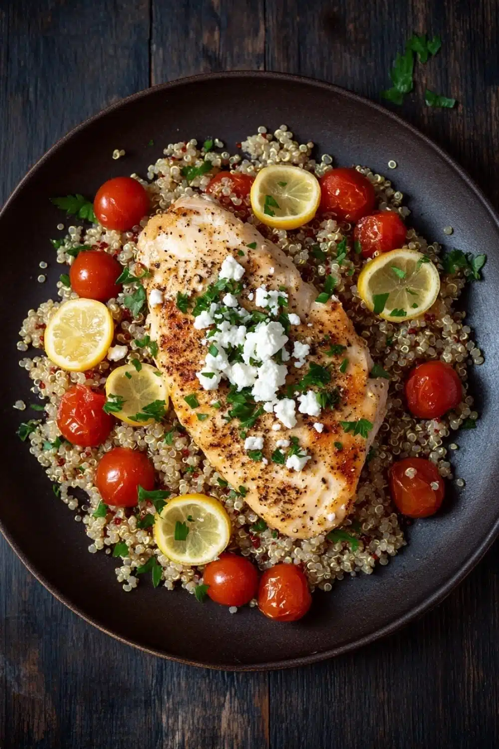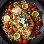 A bright and flavorful one-pan meal featuring tender chicken breasts, fluffy quinoa, tangy lemon, and creamy feta cheese. Perfect for a healthy and satisfying dinner.