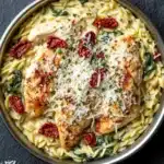A delicious and comforting one-pot meal featuring tender chicken breasts cooked with creamy orzo pasta, sun-dried tomatoes, spinach, and a rich Tuscan-inspired sauce.