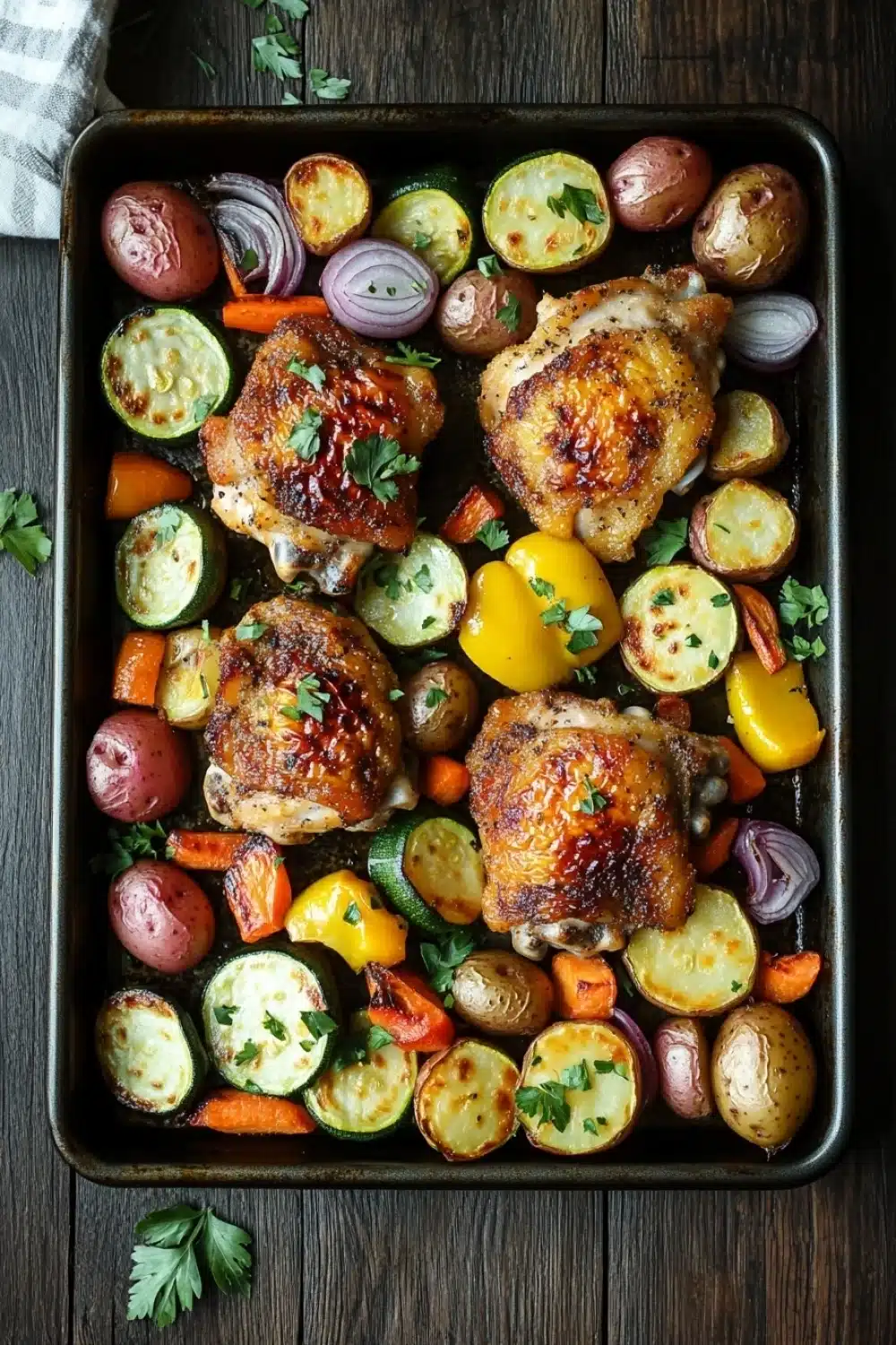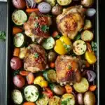 A simple and delicious sheet pan chicken and vegetables recipe that combines tender chicken thighs with a medley of roasted vegetables, seasoned to perfection and cooked all on one pan for easy cleanup.