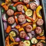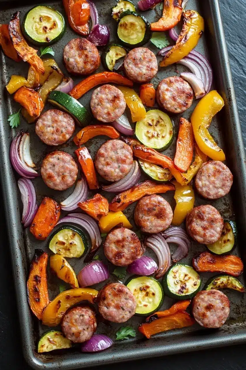 A simple and flavorful one-pan meal featuring savory sausage and a colorful medley of roasted vegetables. Perfect for an easy weeknight dinner with minimal cleanup.