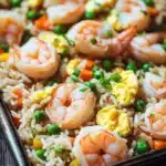 A quick and easy sheet pan shrimp fried rice recipe that combines succulent shrimp, vegetables, and rice all cooked together on one pan for a flavorful, fuss-free meal.