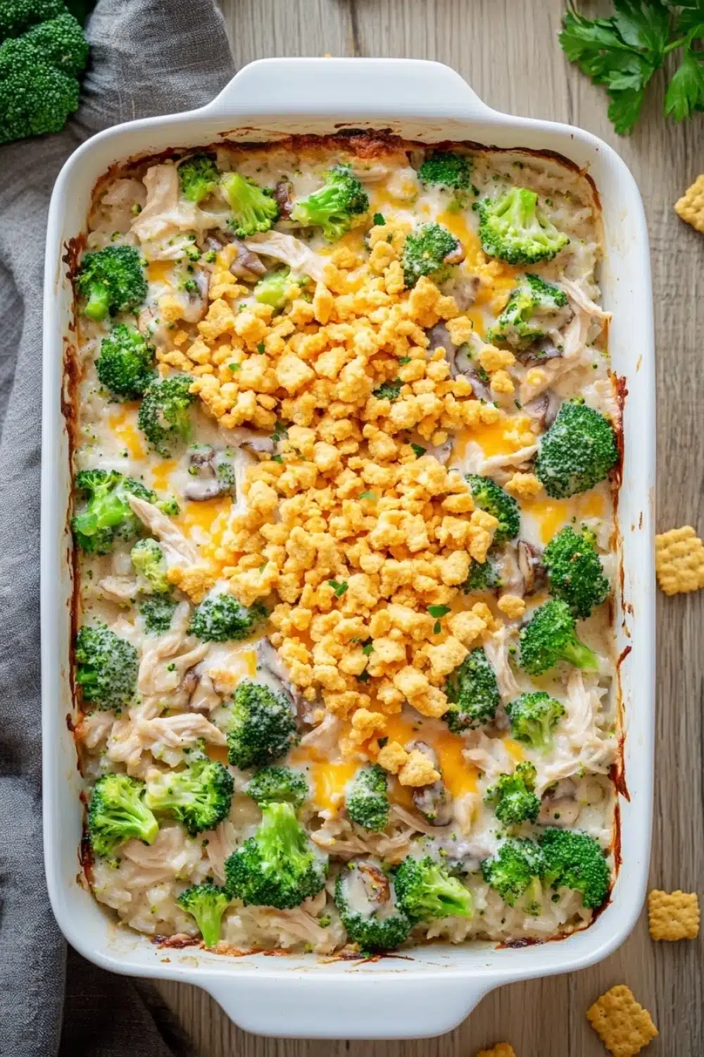 There’s something about the way this casserole bakes that always pulls me back to slower evenings — the kind where the air smells like butter and garlic, and you can hear the soft bubbling from the oven while you set the table. One night, I remember juggling a few things at once — dinner, a phone call from a friend, and a distracted kid asking for a snack. Somehow, I forgot to steam the broccoli a little longer, and it ended up with this perfect little crunch that somehow made the whole dish even better. It’s those tiny imperfections that make it feel homemade, you know? The creamy mushroom sauce blends into the rice and chicken, while the cracker topping crisps up just right, adding a little contrast that keeps every bite interesting.